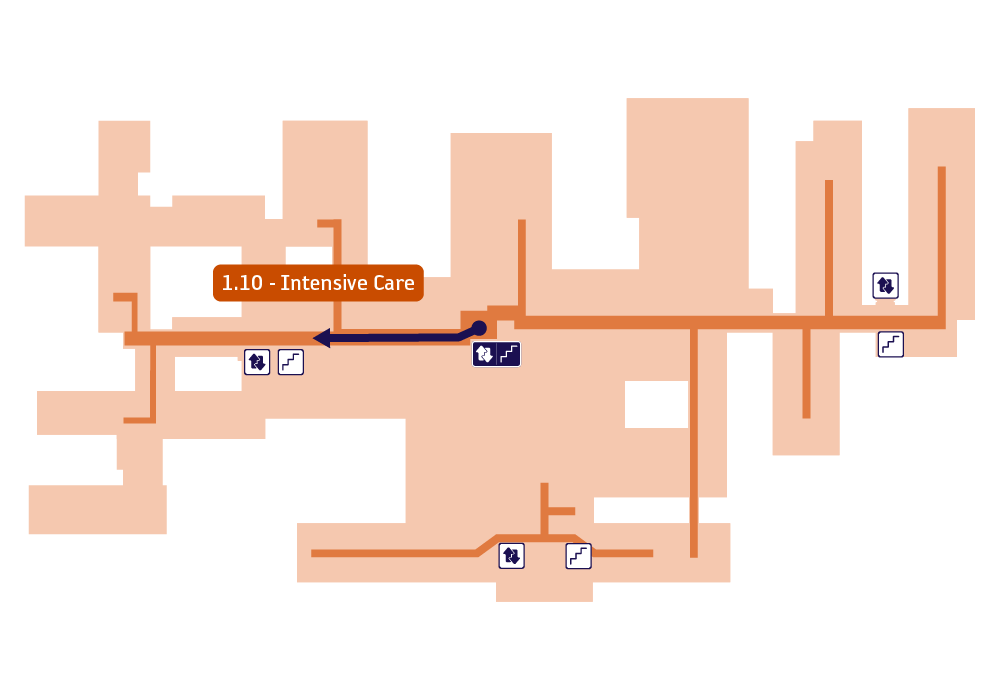 Vanuit de trap of lift gaat u linksaf de gang in. Volg route 1.10. Bij route 1.10 vindt u de Intensive Care aan de rechterkant.